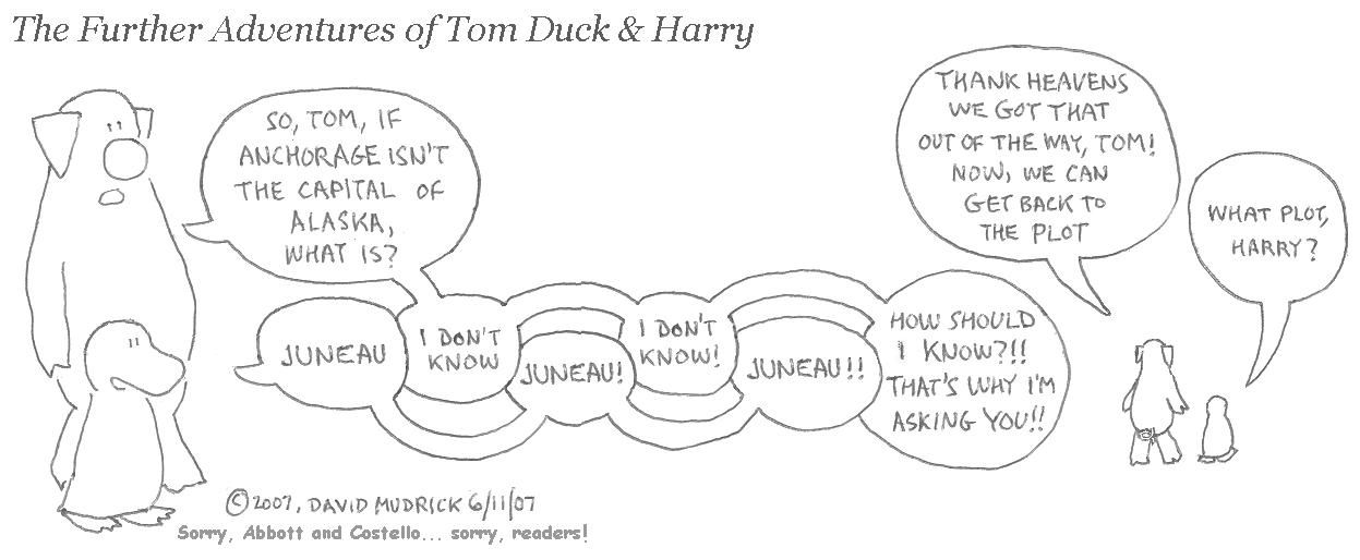I have now produced a significantly expanded, updated 2nd edition of Too Far North, as well as a companion book, Living Too Far North: Drawing Humor from a Winter in Alaska. The latter includes all the cartoons plus a running commentary on each and on the vagueries of life in that rural environment. There is also a bit of information on our family's trip and sojourn there. These are accessible in pdf on this website at www.tomduckandharry.com/my-alaska-books.