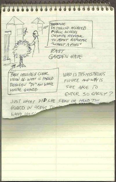 Falls hastily sketched the scene in his steno pad, wrote some pointed follow-up questions and their answers, and then tried to follow the "Princess" through the gate. He was stopped immediately by the guard who demanded "a pass." When questioned as to where one obtained such a pass, the guard told Falls that they were routinely handed out each morning on a first-come, first-served basis at the White House Visitors Center on Pennsylvania Avenue - a likely story if ever there was one. Falls, pressing the guard for more information, asked him if he had a key to this gate.