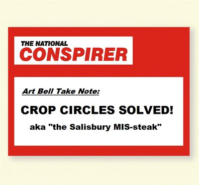 I was walking through the paths of flattened wheat that had appeared overnight on this lonely plain near Salisbury, when I put my finger on it - or rather put my foot in it - a cow pie still steaming in the crisp morning air. For me this was the final piece of evidence, albeit circumstantial and circumferential, for my theory on the origin of crop circles. The freshness and placement of this meadow muffin - above, not covered by the flattened stalks of grain - were the convincing factors. The numerous fresh field roses I found subsequently on that morning were similarly positioned: All had been produced during or immediately after the creation of the patterns within which they lay, confirmation that CROP CIRCLES ARE MADE BY HERDS OF MAD COWS RUNNING AMUCK.
