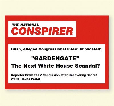 The National Conspirer has broken the story this week on what may become the first major scandal of the Bush administration, according to investigative reporter Drew Falls' conclusion. Despite attempts to avoid his questions and his eventually being bodily removed, Falls was able to interview a White House "Key Official" who inadvertently confirmed a "Bush Connection." There is even a hint of international intrigue as Drew managed to interview a supposed Congressional intern who looked very much like Princess Di, and who was subsequently granted easy access to the White House grounds, shielded by "the Bush." Important questions remain unanswered, perhaps forever, as Falls' notes were torn and a critical portion lost in his scuffle with two Marine guards who removed him from the area.