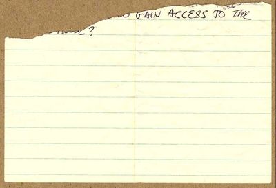 The missing portion of an investigative reporter's steno pad emerged mysteriously in the hand of White House lawyer Noel Quarter during opening remarks in a libel suit against a courageous, conspiracy busting newspaper. Appearing to lack any answers to questions penned by the reporter on the upper portion of the page, which remained in his notebook, this fragment allegedly undermines the earlier indications of a new, major White House scandal, nicknamed "Gardengate" by the press. Defense sources claim the evidence was altered while in government hands.