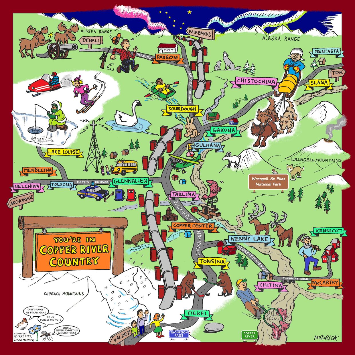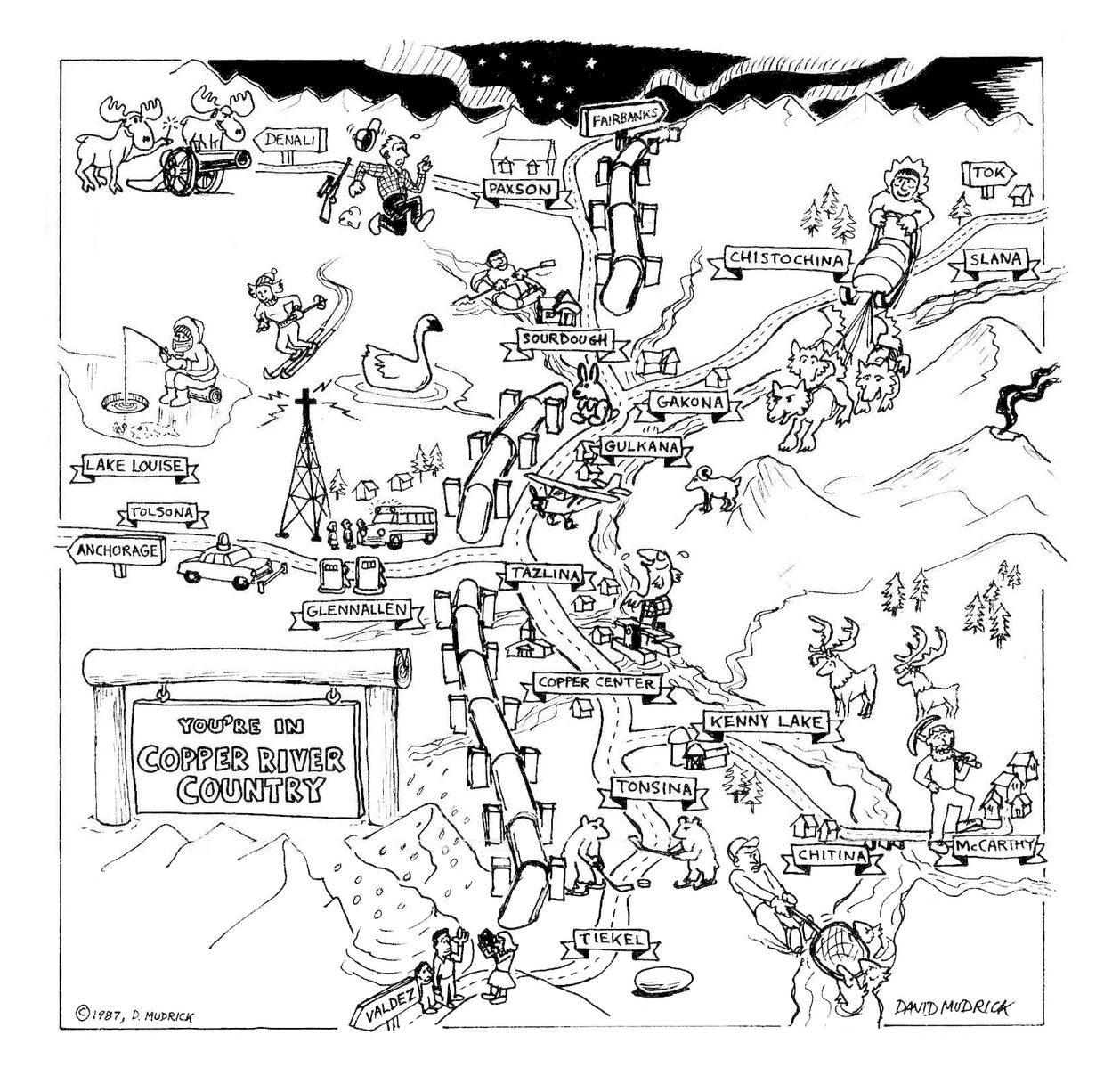 During the 1986-87 school year, my wife Pat and I and our then five children sojourned within the vast Copper River Valley, an area the size of West Virginia with a human population of about 2,500, bounded on four sides by mountain ranges containing the United States' largest National Park and a semi-active volcano. There were many sources for humor despite the sometimes dangerous and always tenuous ability to live there. Some 35 years later during the COVID-19 pandemic, I updated and colored my cartoons and area map, which had appeared in the late '80s in our friends and publishers' local news magazine the Copper River Country Journal and in our self-published book Too Far North: A Northern Cartoon Odyssey, for use in the resurrected Copper River Country Journal 2020, now a website. My new books, the 2nd edition of Too Far North and Living Too Far North: Drawing Humor from a Winter in Alaska each contain the 61 cartoons in the original book, plus an additional 25. The latter book includes my commentary on each of the cartoons, along with humorous insights into life in rural Alaska plus a little information on our travel to and sojourn there. For related information, see TD&H's Alaska Connection.
