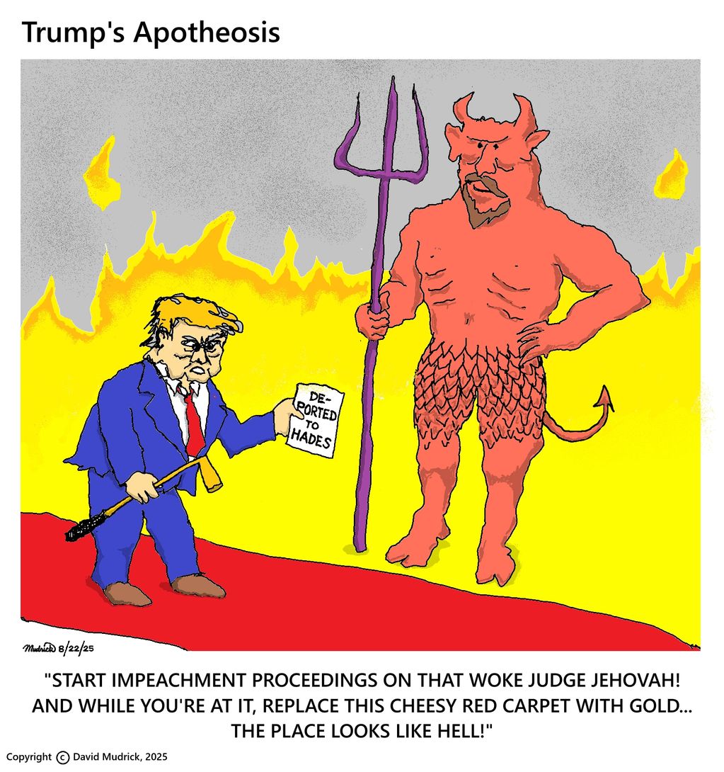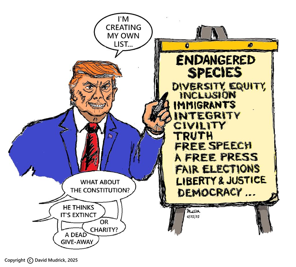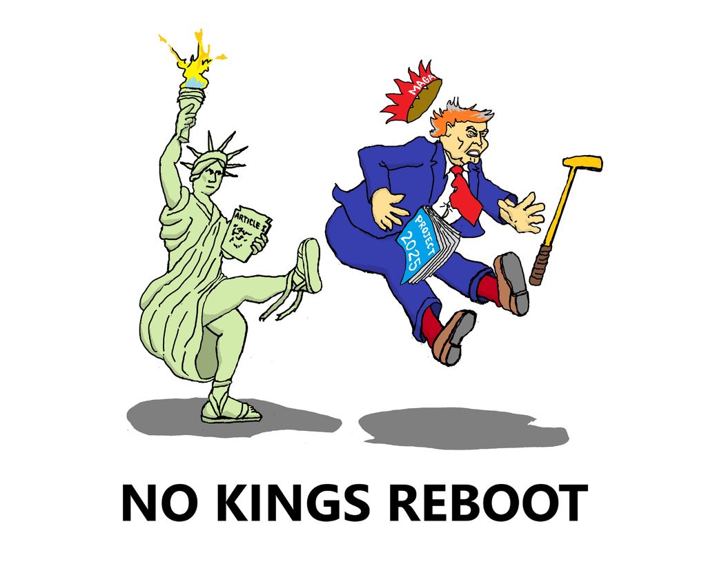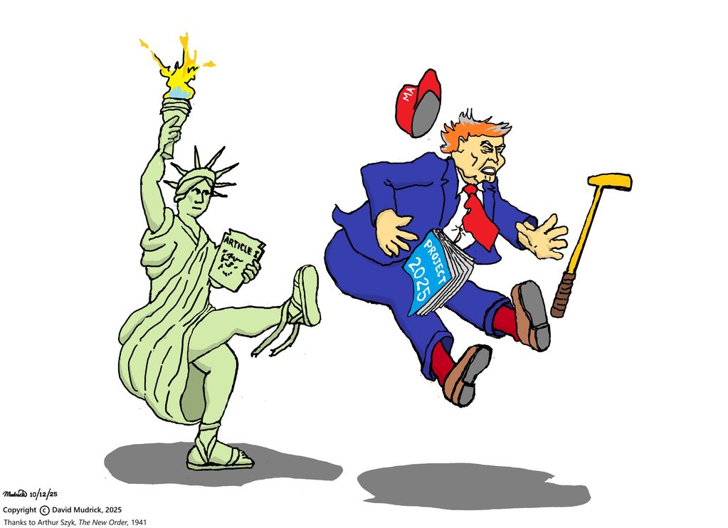 This admittedly "if only" cartoon shows Lady Liberty, holding the Constitution, giving Trump and by implication his Project 2025 cronies the boot. Article I on her tablet empowers the congress to do that, but unfortunately the Republicans in control of both houses remain spineless and feckless. Note the shout out to Arthur Szyk, in particular his cartoon of Haile Selassie booting Mussolini.