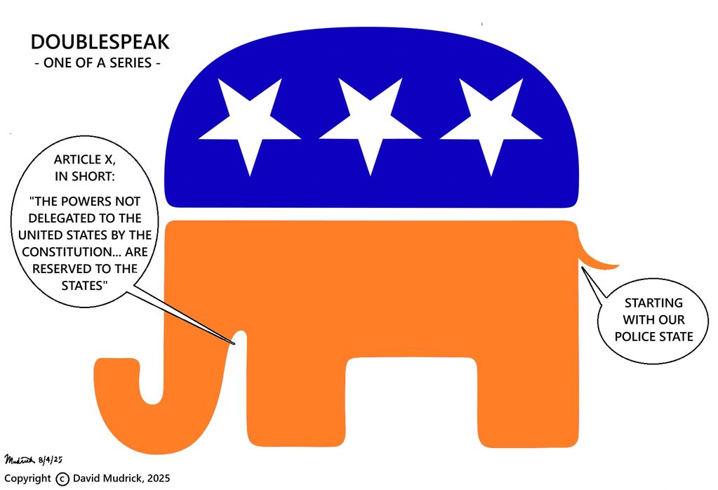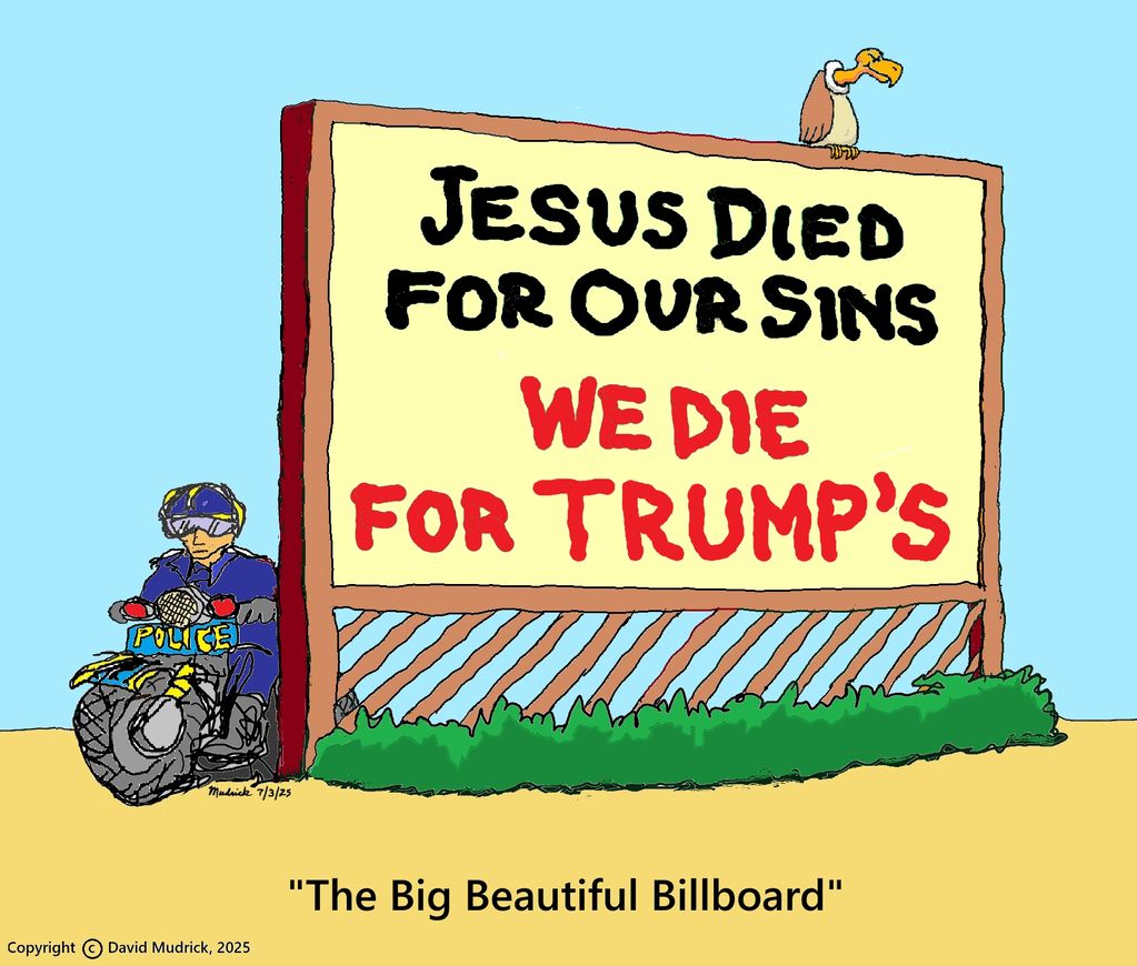 This is a reminder to so-called Christian Nationalists, who sometimes seem neither Christian in their speech and actions nor invested in the welfare of the nation. I penned this couplet months prior to drawing it, which was done during the downhill slide ending with the passage of the "Big Beautiful Bill". Hence, it appears on a billboard, a common practice in rural and southern precincts.