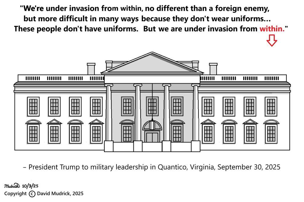 Trump projecting, again, with the real threat to democracy within coming from within the White House. He was addressing the assembled top brass of the US military, trying to enlist them in attacking the people, cities, and democratic institutions of the United States. We pray they continue to honor their pledge to protect and defend the Constitution against all enemies, foreign and domestic.