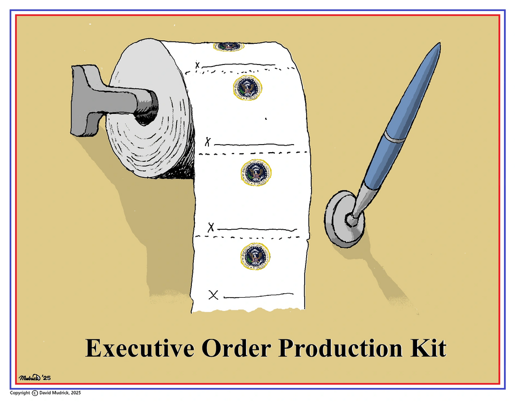 As with the inaugural cartoon, Trump undercut me on the day I drew this by telling the press that no gold paint looks like real gold; you need gold leaf for that authentic imperial pretense.