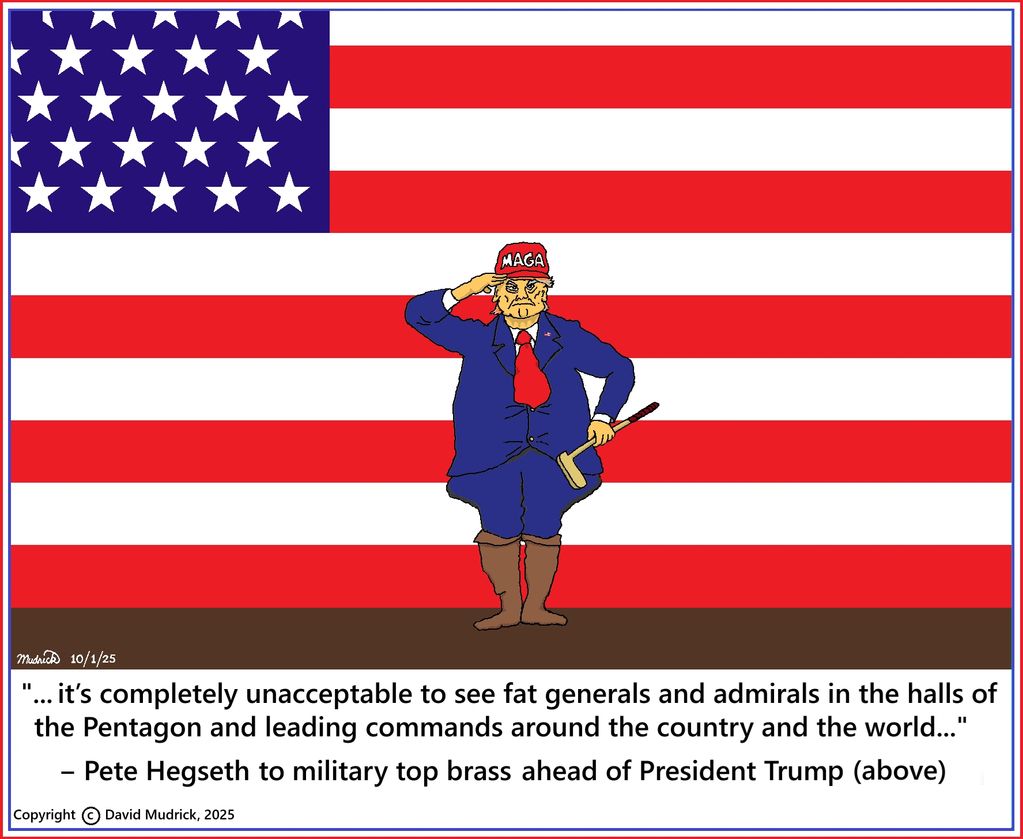 Haven't we seen this movie before? Defense Secretary Pete Hegseth dragged our top military brass from around the world to lecture them on readiness, i.e., appearing fit on Fox News videos. President Trump then not briefly briefed them on their new mission, to wage war on the "enemy within" which apparently includes those saying hurtful things about him or drawing unflattering cartoons.