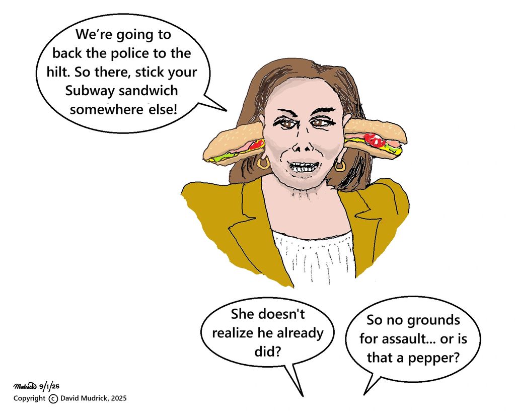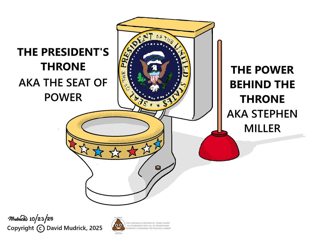 Inspired by the White House's AI video of President Trump bombing No Kings demonstrators with feces and the explicit or tacit approval of his coreligionists, I've marked this drawing with an official seal and imprint reading, "This cartoon is certified as 'funny satire' in accordance with all of Speaker Mike Johnson's standards for political humor".