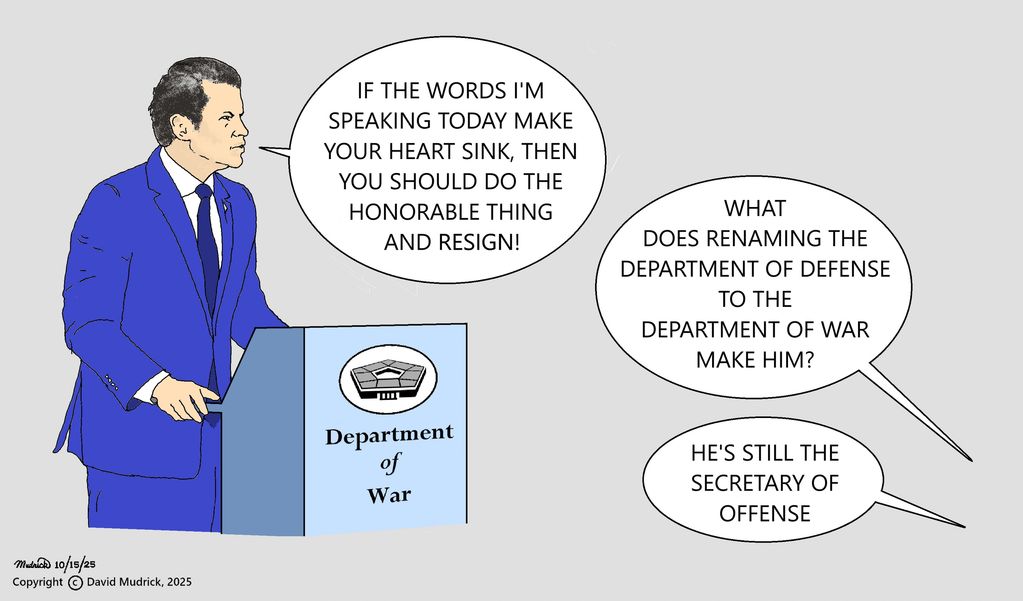 No. 12 - Pete Hegseth's ill-conceived mass gathering of the military's top brass, in which he and Trump pushed their plan to prioritize the use of the armed forces against internal domestic threats - read critics of Trump - triggered this cartoon.