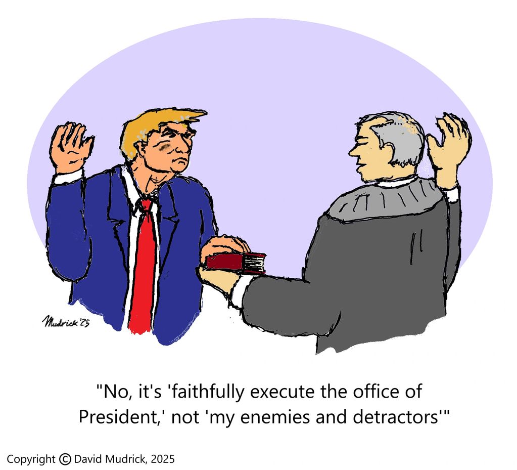 Fast forward to his second incarnation, January 24, 2025, Trump immediately rendered this cartoon, drawn before the inauguration, inaccurate. He didn't put his hand on a bible, not even the Trump edition. Ironically, it could be argued that this proved his belief in God, whom he feared would strike him down on the spot for swearing a false oath. Still, the caption was spot on.